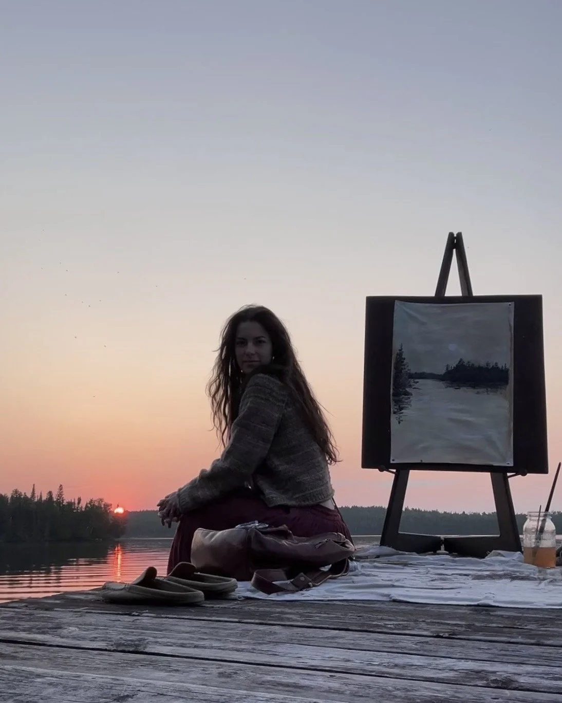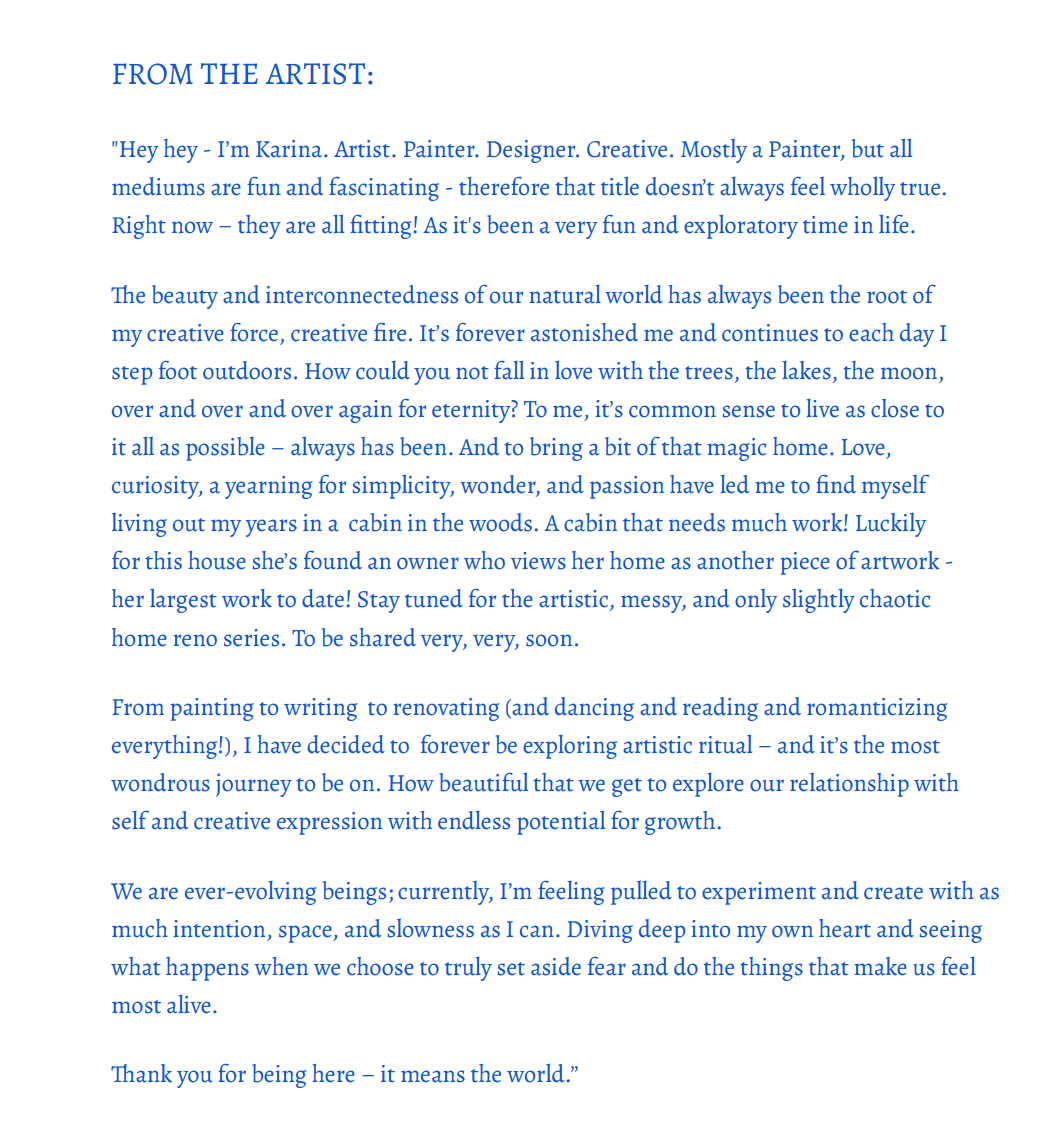 Karina Herrera is an artist and creative living in Ely, Minnesota - a town bordering the pristine Boundary Waters Canoe Area Wilderness. Her work turns the wonder and wildness of the Northwoods into playful, contemporary, textural paintings. She crafts every part of the artwork with her own hands - from stretching recycled canvas to building custom frames, all at her home studio in the woods. Her work aims to honor the sacred force of nature by bringing a bit of her mystery and awe into our homes - to be reminded each day of our connection to earth, to wild, to origin.